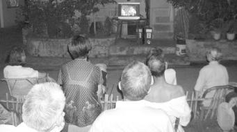 每当夜幕降临时,在石羊社区,总有一群老人聚集在一起,边纳凉边观看自己喜爱的戏曲节目。图为老人们正在津津有味地观看绍剧《龙虎斗》。