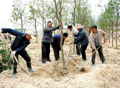 县滨海新城投资1800余万元,于去年12月25日开始对约28万平方米的绿化带进行绿化,预计整个绿化工程可在6月底前完工。图为施工人员在滨纬一路植树。 (陈维连 祁慧娟)