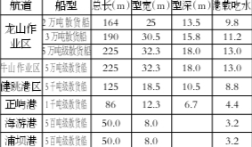 考虑到三门湾海域基本条件,为了最大限度利用各个深水资源,充分发挥工程投资经济效益,适应国内海运趋势,结合《台州港总体规划》、《健跳港区控制性规划》等,各个航道的代表船型见下表。
