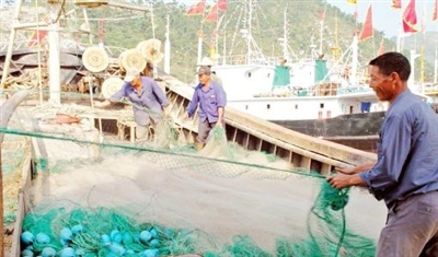 9月16日是东海开渔日。我县停泊休渔近3个月的渔船,从16日12时起陆续扬帆出海,开始新一轮的捕鱼作业。 图为16日上午,健跳港上渔民整装待发。 本报记者 陈维连