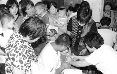 为了预防季节性流感,县中医院在每月2、7日组织医务人员对广大市民进行注射流感疫苗,预防流感发生。 图为县中医院医务人员对儿童注射流感疫苗。 本报记者 陈维连