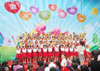 左图:为庆祝“六一”儿童节的到来,5月27日上午,县蓓蕾幼儿园举行“歌颂祖国、喜迎六一”文艺汇演。