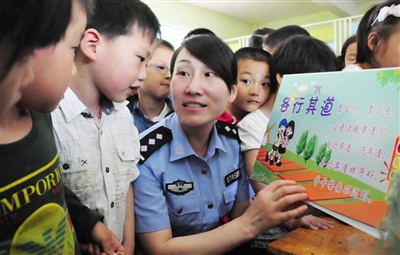 6月6日上午,县公安局督察大队会同沙柳派出所,为沙柳中心幼儿园小朋友讲解交通规则、防溺水和火灾逃生等安全防范知识,受到老师和学生的好评。图为民警正在讲解交通规则。 本报记者 包美芬 特约记者 林利军 摄