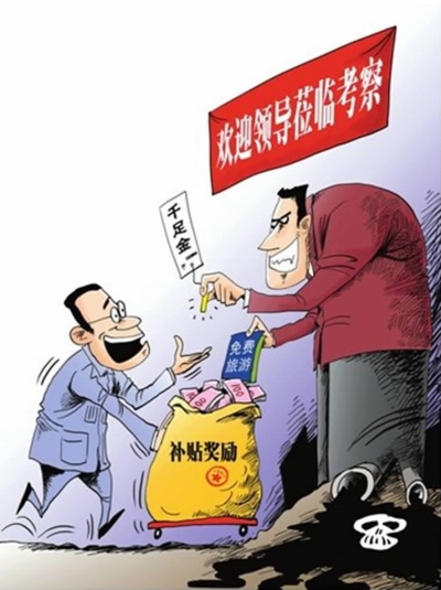 2012年5月,湖南醴陵市政府引进一个招商项目,该项目曾涉嫌“污染”被责令搬迁。为打消公众的疑虑,醴陵市组织市、乡镇领导及村民代表近百人,组团去该企业考察。据了解,企业为考察团提供全程豪华服务,还向每名考察者赠送一根5克重的千足金金条。送金条、旅游观光,这是变相的贿赂,哪是考察!