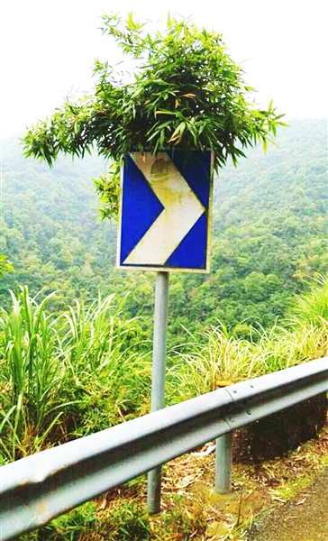 在连接亭旁、横渡两乡镇的狮白线10公里处,有一个道路交通指示牌顶端冒出一簇浓郁的竹叶,竹根和竹枝则隐藏在指示牌里。