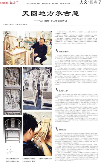 “这份传统的、极具特色的圈椅文化应该继续传承下去,让更多的人,甚至全世界的人都能看到我们‘三门圈椅’的存在价值。”吴师傅笑着说,而在他的笑声里却隐约透露出浓浓的担忧和无奈。