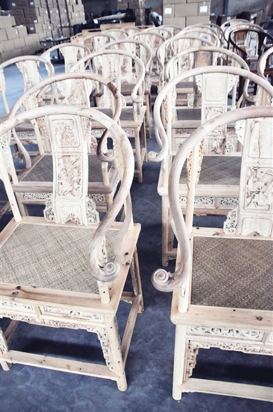 走进作坊,首先带来的是一种嗅觉上的享受:一股木头的清香。只见各种各样的木头在手艺师傅们的手中被灵活运用,做圈、雕花、打磨……经过一道道的工序转化,看似普通的木料,开始逐渐发挥出它的作用,从而构成圈椅的独特魅力。