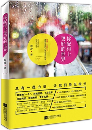 《你配得上更好的世界》:是周冲第一部随笔集。此书以两性关系、世事、人性、电影、书籍等为话题,或嘻笑怒骂,或悲悯关怀,或尖锐剖析,直面这个世界的荒诞、痼疾与沉疴。