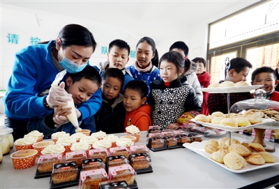 12月1日,“西门子”家电三门店组织工作人员来到亭旁镇彭赖小学,为该校的18名留守儿童上了一堂烘焙课,并为他们送上文具、食品等礼物,陪他们度过了一段温暖时光。图为活动现场。刘 炜 摄