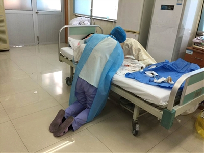 随着二胎的放开,县人民医院(中医院)也迎来了生产高峰。据统计,该院每天有20多名产妇生产,导致现有产房的产床无法满足需求。图为日前,因为没有专用床位,产房内一个产妇在铺有无菌单的病床上生产,该院助产士“跪”在地上为其接生。 金回芳 摄