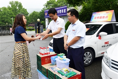 除了相关部门,不少爱心志愿者也齐齐为高考助力。记者在三门中学校门口看到,中国人民保险三门支公司的六七名爱心志愿者正手拿矿泉水,面带微笑地为过往考生和家长送去夏日里的一丝清凉。