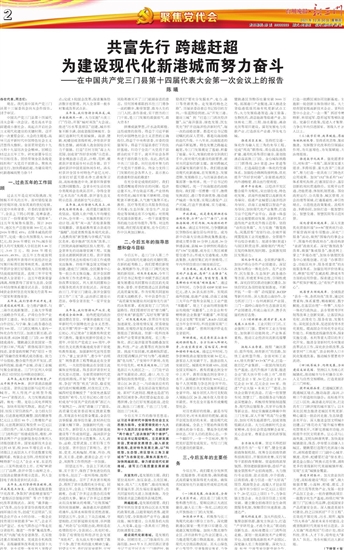 各位代表,同志们,潮涌三门湾,扬帆正当时。使命在肩,惟有奋斗。让我们更加紧密团结在以习近平同志为核心的党中央周围,在省委、市委的坚强领导下,一心一意谋发展,一往无前勇争先,一以贯之抓落实,为建设现代化新港城而努力奋斗,以优异的成绩迎接党的二十大胜利召开!