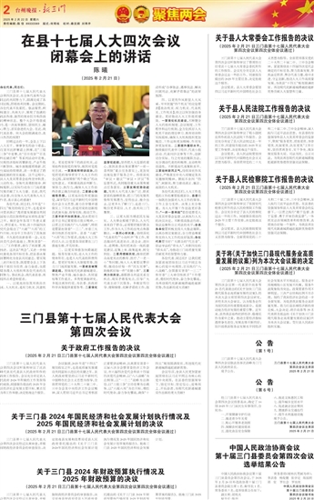 三门县第十七届人民代表大会第四次会议经过认真审查,并根据财政经济委员会的审查报告,决定批准县发展和改革局受县人民政府委托提出的《关于三门县2024年国民经济和社会发展计划执行情况及2025年国民经济和社会发展计划草案的报告》,批准三门县2025年国民经济和社会发展计划。