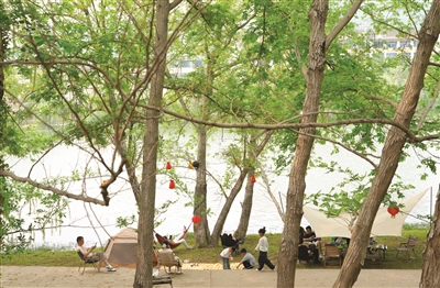 春和景明,阳光正好,越来越多的人选择走进自然,放松心情。图为日期,在沙柳街道清溪两岸,市民在树林里搭起帐篷,享受春日悠闲时光。林利军 摄